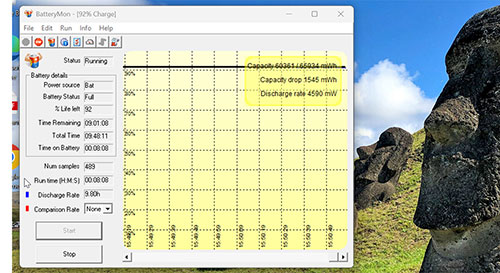 Hot-swappable 6-cell 10.8V, 7,800 mAH 84.2 watt-hour Li-Ion ("16 hrs."), 5-min bridge battery,; optional second 6-cell 10.8V, 4.700 mAH 50.8 watt-hour battery |