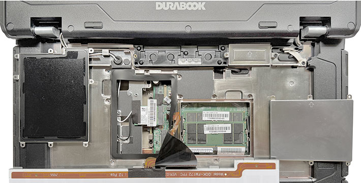 We generally open up all review units that pass through the RuggedPCReview.com test lab. That's because ruggedness starts inside. A good rugged unit is built rugged from the ground up. With most laptops, the bottom of the unit comes off and affords a full look at at the insides. The DURABOOK Z14I's designers, however, took a dfferent approach, one where all electronics sit in the strong system box and it is the keyboard side that comes off.