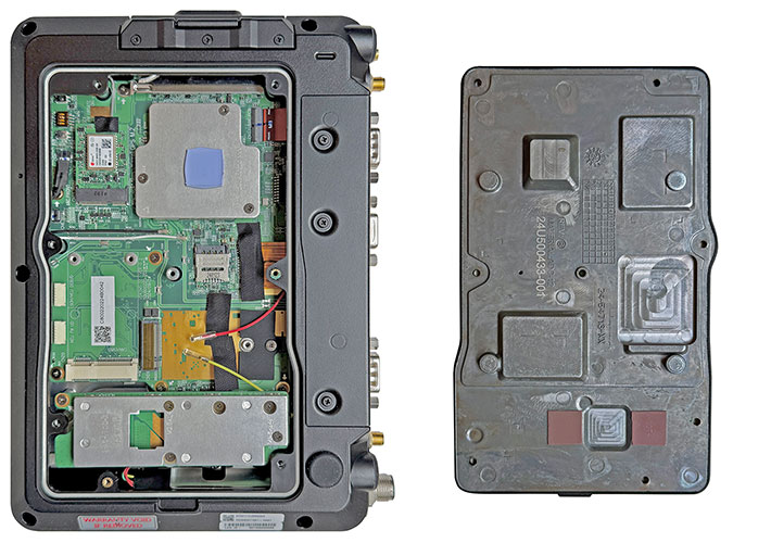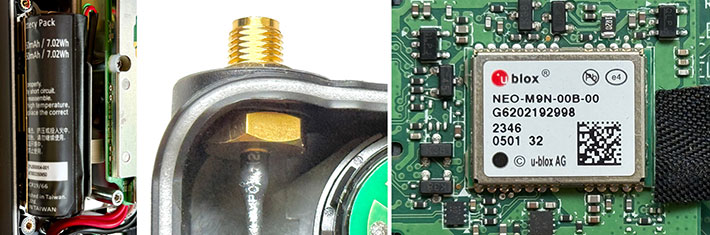 Finally, below, some details. From left to right, the 7 watt-hour bridge battery; the tongue-and-groove seal between the housing halves; and the dedicated ublox NEO-M9N concurrent GNSS module that offers excellent accuracy via optimized multi-band signal processing, low power use, NavIC support, good performance in dense urban settings, and the ability to receive up to four GNSS systems simultaneously.