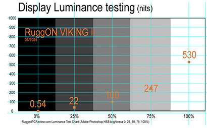 Vehicle displays must be bright enough to ensure easy readability in a variety of environments. While extreme sunlight readability isn't typically required — since VIKING units aren't likely to be used in direct, unobstructed sunlight — the screen still needs to remain clearly visible under all common in-vehicle lighting conditions. To meet that need, RuggON specifies a display brightness of 500 nits. In our lab tests, we measured a peak output of 530 nits. That puts the VIKING II's luminance on par with modern consumer tablets and smartphones — more than sufficient for most indoor, shaded outdoor, and in-vehicle scenarios.