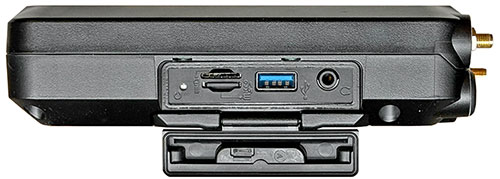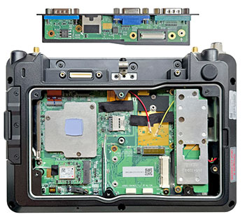 The close-up image above highlights the VIKING II's primary I/O area. Unlike on most rugged tablets, except for unused antenna pass-through ports, there are no protective rubber port covers here. That's because the I/O block is a modular unit that connects to a sealed interface on the device housing. This design prevents dust and liquids from entering the unit through the ports — an effective solution, especially since exposure to debris and moisture is typically limited inside vehicles.