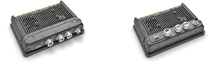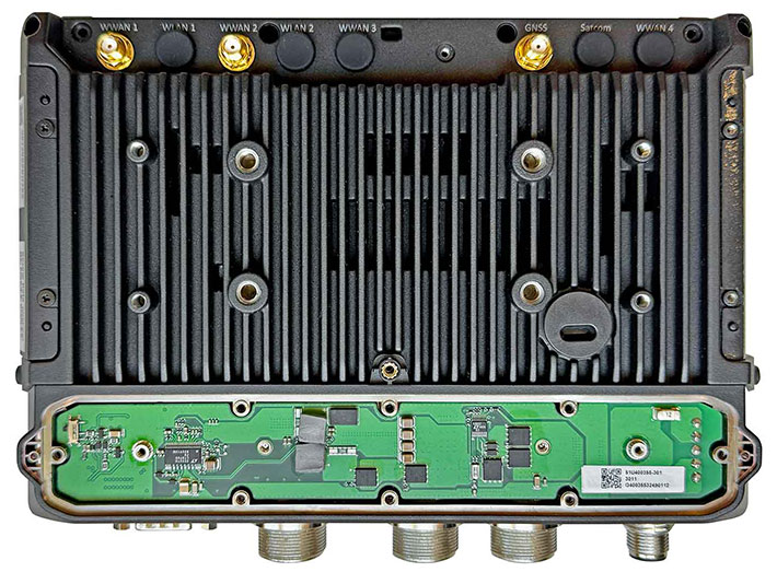 The thick, heavily finned rear section not only functions as a passive heatsink but also serves as a rugged structural base. It includes standard 35 x 75 mm VESA mounting holes, as well as an additional screw-mount pattern likely intended for accessory attachments. Also notable are cutouts supporting up to eight external antenna connections: two for LAN, four for broadband, and one each for GNSS and Satcom.