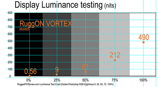 RuggON has extensive experience in designing displays for vehicle-mounted systems, and its devices are generally known for excellent daylight readability. That makes the VORTEX's 500-nit luminance rating seem somewhat modest, especially considering it draws from vehicle power and doesn't need to conserve battery life. The brightness is sufficient for use inside enclosed vehicles, but a higher-luminance option would be welcome for outdoor or high-glare environments.