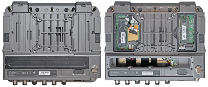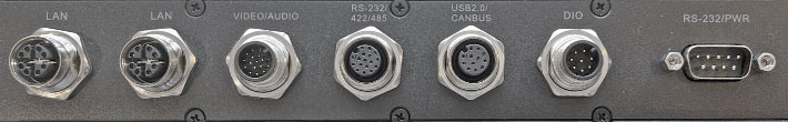 The vehicle-mount offers excellent onboard connectivity via a full complement of downward-facing waterproof M12-type screw-on ports: two USB ports, two gigabit LAN jacks, dual legacy serial ports, digital IO, audio/video, and optional CANBUS or SAE J1939 ports. On the sides of the units are an additional USB 3.1 port as well as a reversible USB Type-C port with DisplayPort support.