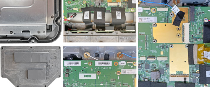 Below you can see some of the many interesting details of the VULCAN X. Clockwise from the top left, the o-ring seal between the two halves of the housing, the neatly labeled ribbon cables, internal mPCIe expansion connectors, barcodes to mark important areas of the motherboard, and one of the two aluminum alloy access covers with conductive material to assist in removing heat.