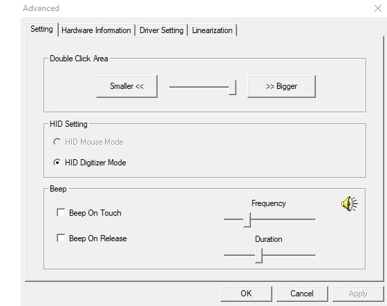 The HIDeGalaxTouch utility also allows sizing the double-click area, beep settings, adjusting edge compensation and various types of calibration.