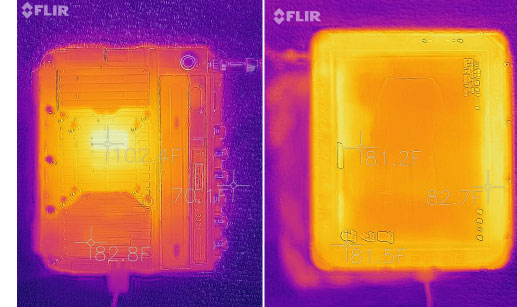 Fanless designs eliminate the drawbacks of fans by using heat pipes and heatsinks to dissipate heat. The VULCAN X uses its heavy metal body to act as a heat sink that dissipates the heat generated by the processor and ancillary electronics to the exterior. This means the unit will heat up, and we recorded that with our Flir ONE Pro thermal imaging camera. During normal operation, we saw surface temperatures between 80F and 85F in the front of the unit, and between 100F and 105F in the hottest spots in the back. No problem there.
