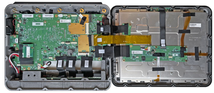 The front part contains the LCD display and ancillary electronics, all mounted on and protected by a strong steel subframe. The heavy rear part hosts the motherboard with all I/O as well as additional expansion connectors. There are three cables between the two parts of the housing, so caution is advised on disassembling.